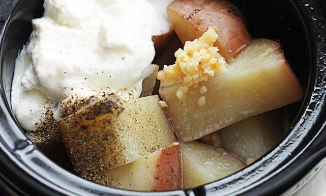احضري طبق التقديم و ضعي البطاطس والزبادي.