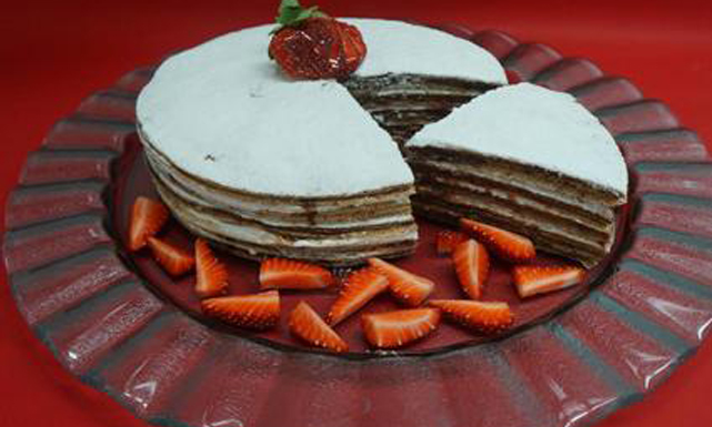 1 كيلو طحين3 بيضات 50غ سكر خشن1.5 ليتر حليب سائل20غ ملح10غ فانيليا10غ برش ليمون100غ زيت نباتيمكوّنات القالب: 300غ شوكولا للدهن150غ كريما حيوانية مخفوقةمكوّنات للزينة:50غ سكر ناعم30غ فراولة300غ مربّى التوت